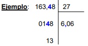 D) División de un número decimal por uno natural: Para dividir un número decimal por un número natural se hace la división como si fuesen números naturales, pero se pone una coma en el cociente al bajar la primera cifra decimal.