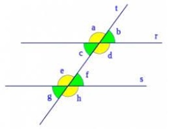Dos rectas paralelas cortadas por una recta secante forman ocho ángulos, los cuales en la imagen están señalados por letras minúsculas: a, b, c, d, e, f, g, h
