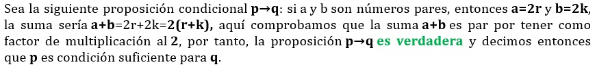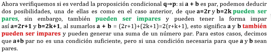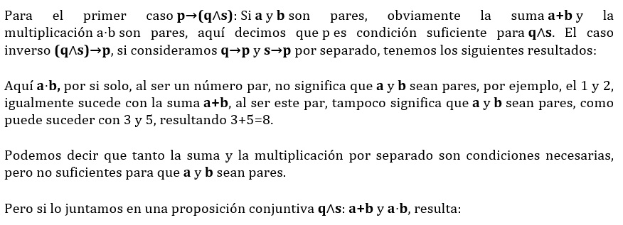 Para que esta última fórmula se cumple, es obligando que b sea también par. Por tanto, concluimos que las proposiciones q y s no solo son condiciones necesarias, sino también son condiciones suficientes para que p se cumpla.
