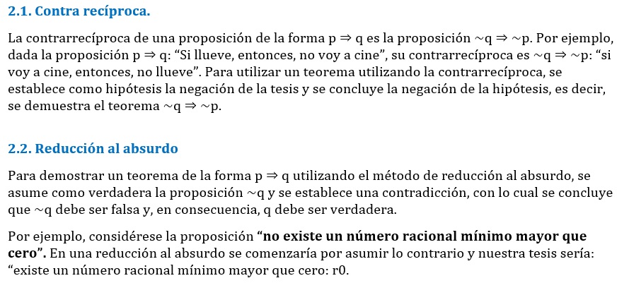 Los principales métodos indirectos de demostración son la contrarrecíproca y la reducción al absurdo.