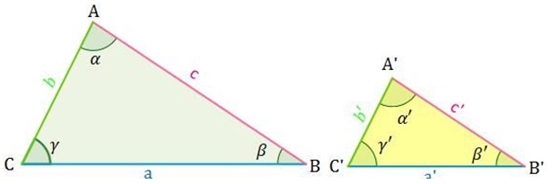 Aquí tenemos un caso, donde se ven los elementos homólogos (ángulos y lados) con la igualdad o congruencia de sus ángulos y la proporcionalidad de los lados (Ver Gráfico anterior)