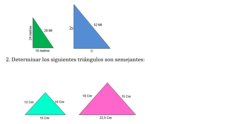 1. Los catetos de un triángulo rectángulo que miden 24 m y 10 m. ¿Cuánto medirán los catetos de un triángulo semejante al primero cuya hipotenusa mide 52 m?