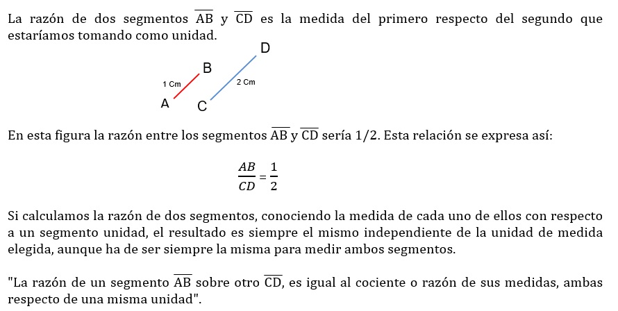 Si calculamos la razón de dos segmentos, conociendo la medida de cada uno de ellos con respecto a un segmento unidad, el resultado es siempre el mismo independiente de la unidad de medida elegida, aunque ha de ser siempre la misma para medir ambos segmentos.