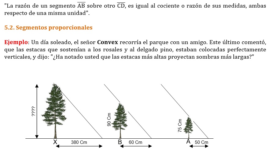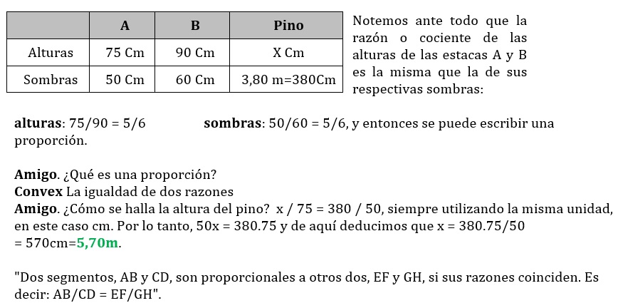Es cierto - respondió Convex, además, las sombras son proporcionales a las alturas; por eso, con ayuda de una estaca podría hallar la altura del pino sin medirlo.